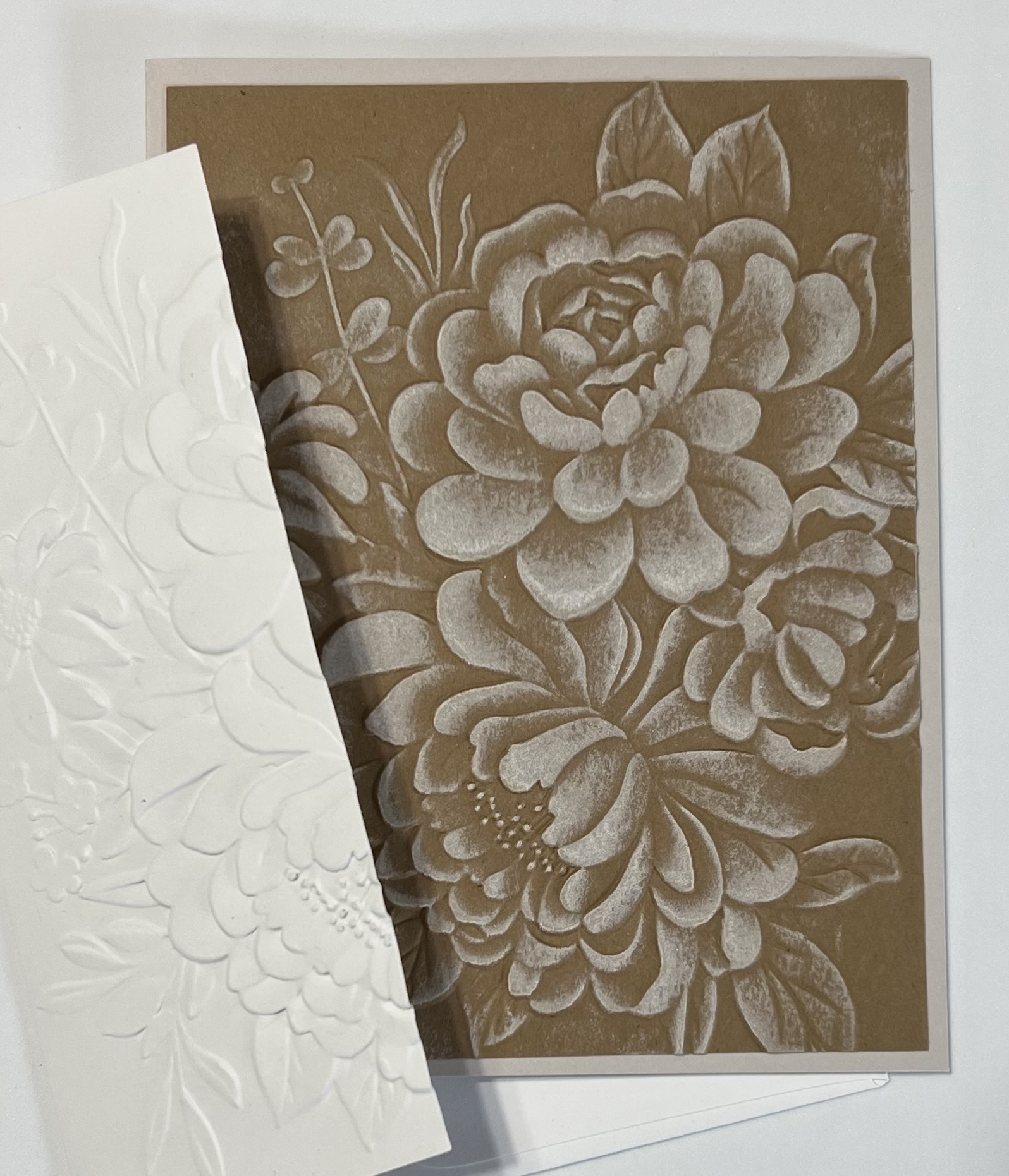 This set of 4- 3D embossed notecards, handmade by Pat, is designed with elegance to the max. Each measures 4.25″x 5.5″