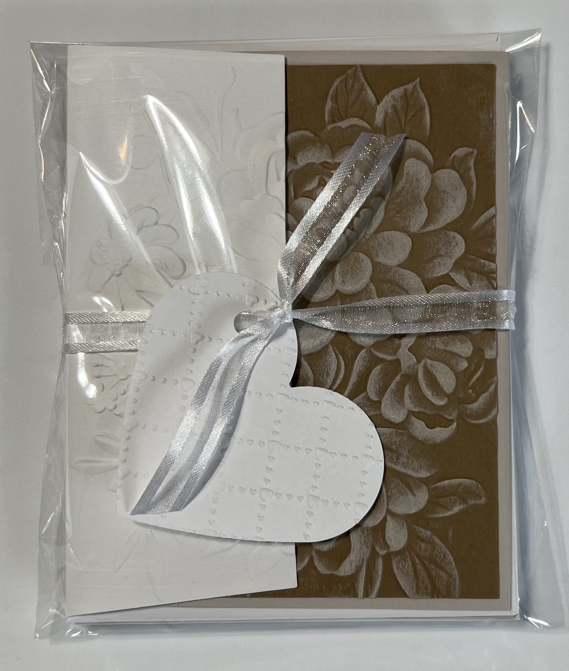 Cards are packaged in a clear cellophane sleeve and tied with an organza ribbon.