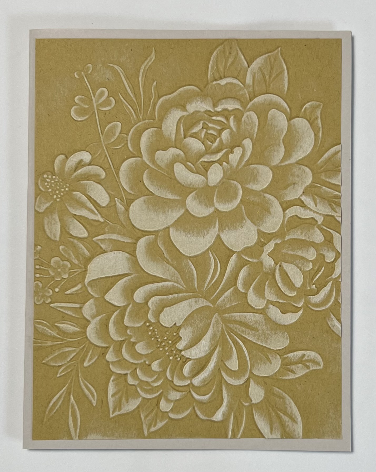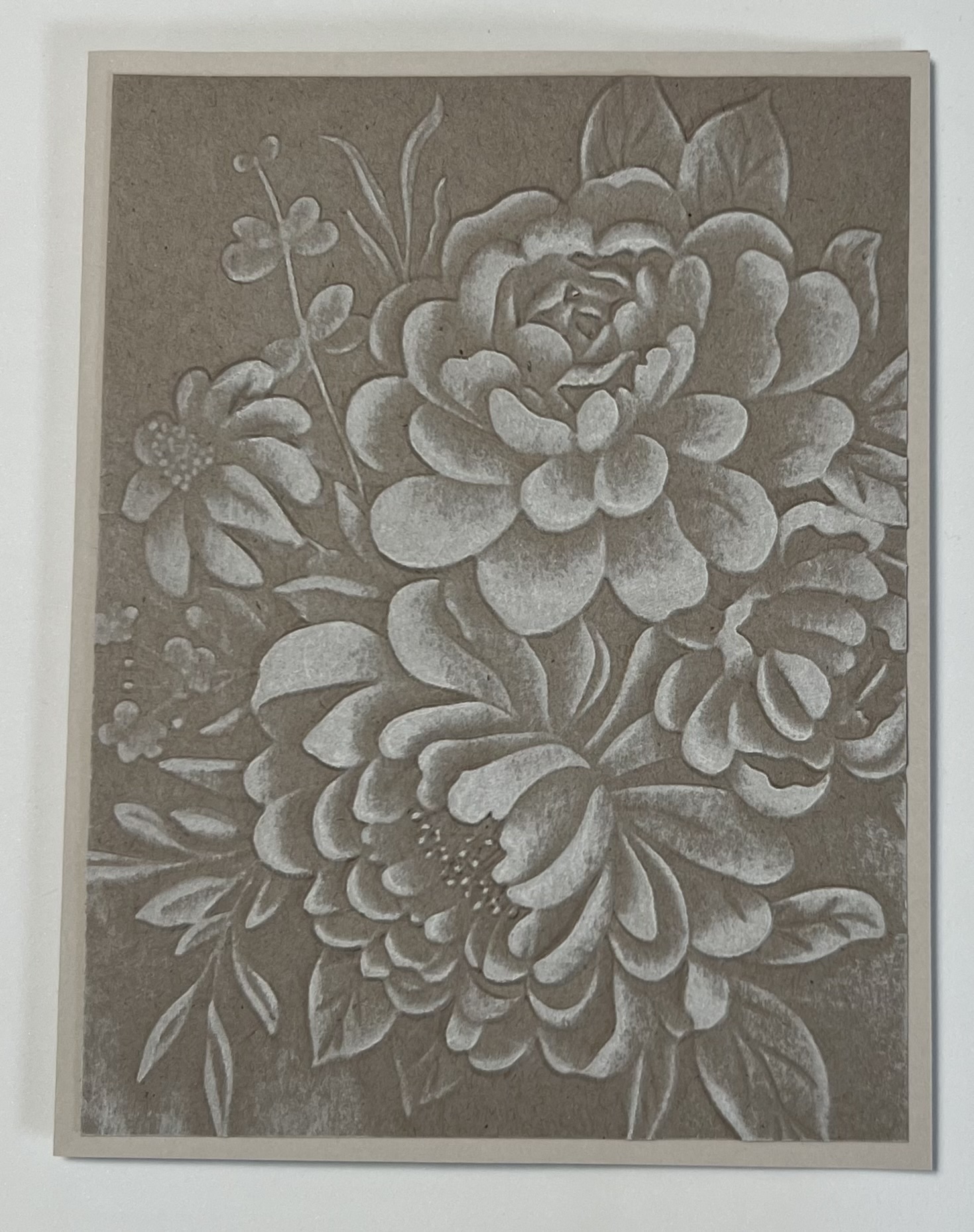 Beautiful bouquet in 4 different stone colors on light gray cards that are raised and hand painted with a white frost.