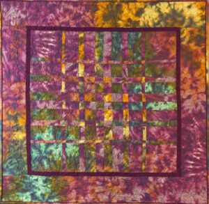 “Springtime” colored fabrics were chosen to complete this modern wall hanging. Spectacular splashes of fuchsia, yellow, aqua and lavender highlight this tie dye like fabric.